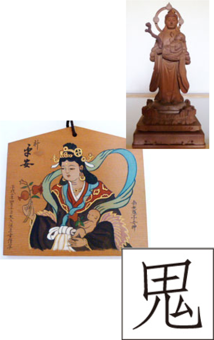 天女型の場合は歓喜母・愛子母などともいい、胸に赤ん坊を抱いて左手を添え、右手には吉祥果を捧げ、足元に2~3人の子供が寄り添っています。