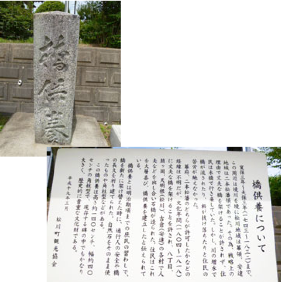 幕府、二本松藩のどちらかが許可したかなどの経緯は不明ですが、文化年間(1804~1818)に丈夫な橋を架けることを許され、八丁目、鼓ヶ岡、天明根(松川)、吉倉(安達)の各村で人夫などを出し合い、石橋が造られました。住民はこれを大総喜び、橋供養を建立したと伝えられていいます。